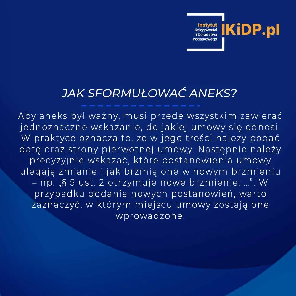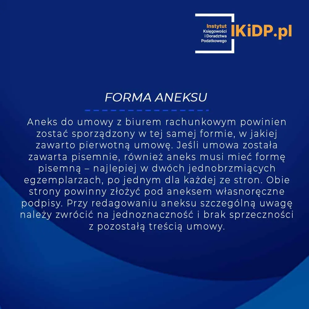 Aneks do umowy z biurem rachunkowym powinien zostać sporządzony w tej samej formie, w jakiej zawarto pierwotną umowę. Jeśli umowa została zawarta na piśmie, również aneks musi mieć formę pisemną – najlepiej w dwóch jednobrzmiących egzemplarzach, po jednym dla każdej ze stron. Obie strony powinny złożyć pod aneksem własnoręczne podpisy zgodne z zasadami reprezentacji danego podmiotu. Przy redagowaniu aneksu szczególną uwagę należy zwrócić na jednoznaczność i brak sprzeczności z pozostałą treścią umowy.