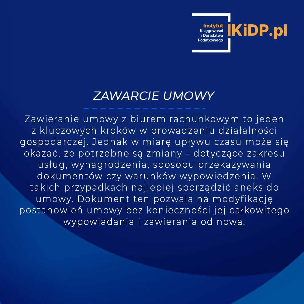 Zawieranie umowy z biurem rachunkowym to jeden z kluczowych kroków w prowadzeniu działalności gospodarczej. Jednak w miarę upływu czasu może się okazać, że potrzebne są zmiany – dotyczące zakresu usług, wynagrodzenia, sposobu przekazywania dokumentów czy warunków wypowiedzenia. W takich przypadkach najlepiej sporządzić aneks do zawartej umowy. Dokument ten pozwala na modyfikację postanowień umowy bez konieczności weryfikowania pozostałych – nie ulegających zmianie, zapisów umowy.