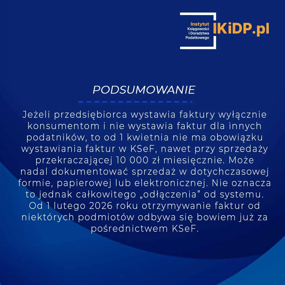 Jeżeli przedsiębiorca wystawia faktury wyłącznie konsumentom i nie wystawia faktur dla innych podatników, to od 1 kwietnia nie ma obowiązku wystawiania faktur w KSeF, nawet przy sprzedaży przekraczającej 10 000 zł miesięcznie. Może nadal dokumentować sprzedaż w dotychczasowej formie, papierowej lub elektronicznej. Nie oznacza to jednak całkowitego „odłączenia” od systemu. Od 1 lutego 2026 roku otrzymywanie faktur od niektórych podmiotów odbywa się bowiem już za pośrednictwem KSeF.