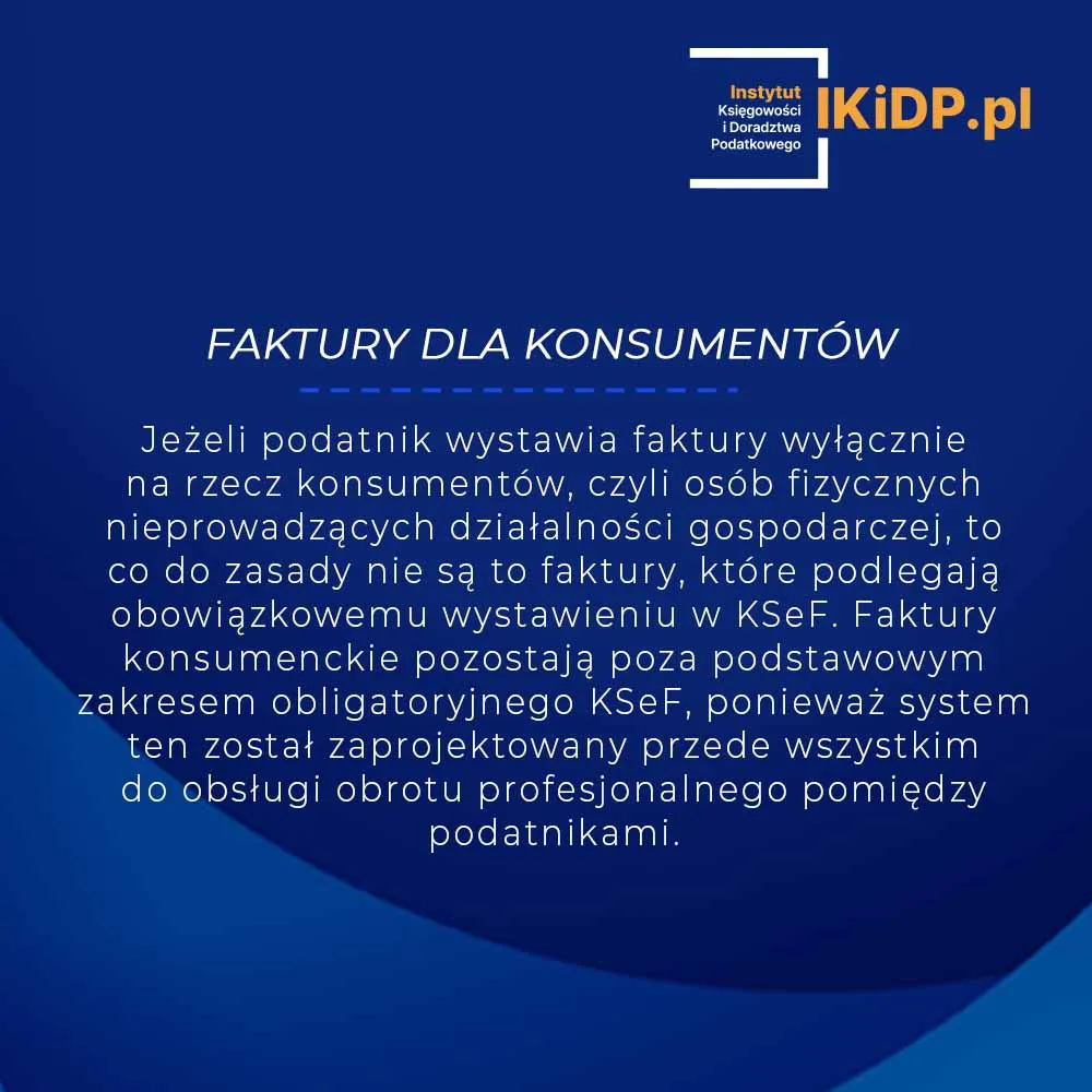 Jeżeli podatnik wystawia faktury wyłącznie na rzecz konsumentów, czyli osób fizycznych nieprowadzących działalności gospodarczej, to co do zasady nie są to faktury, które podlegają obowiązkowemu wystawieniu w KSeF. Faktury konsumenckie pozostają poza podstawowym zakresem obligatoryjnego KSeF, ponieważ system ten został zaprojektowany przede wszystkim do obsługi obrotu profesjonalnego pomiędzy podatnikami.