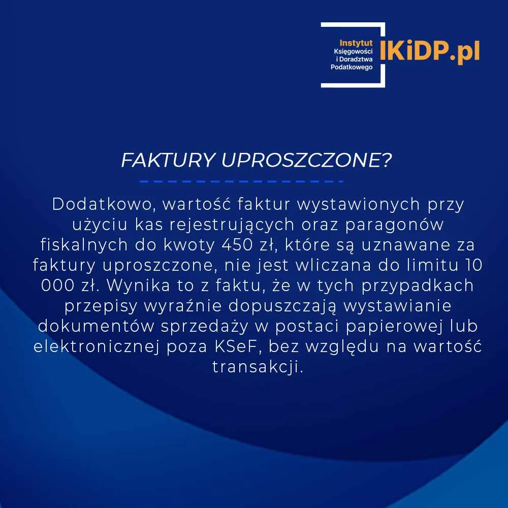 Dodatkowo, wartość faktur wystawionych przy użyciu kas rejestrujących oraz paragonów fiskalnych do kwoty 450 zł, które są uznawane za faktury uproszczone, nie jest wliczana do limitu 10 000 zł. Wynika to z faktu, że w tych przypadkach przepisy wyraźnie dopuszczają wystawianie dokumentów sprzedaży w postaci papierowej lub elektronicznej poza KSeF, bez względu na wartość transakcji.
