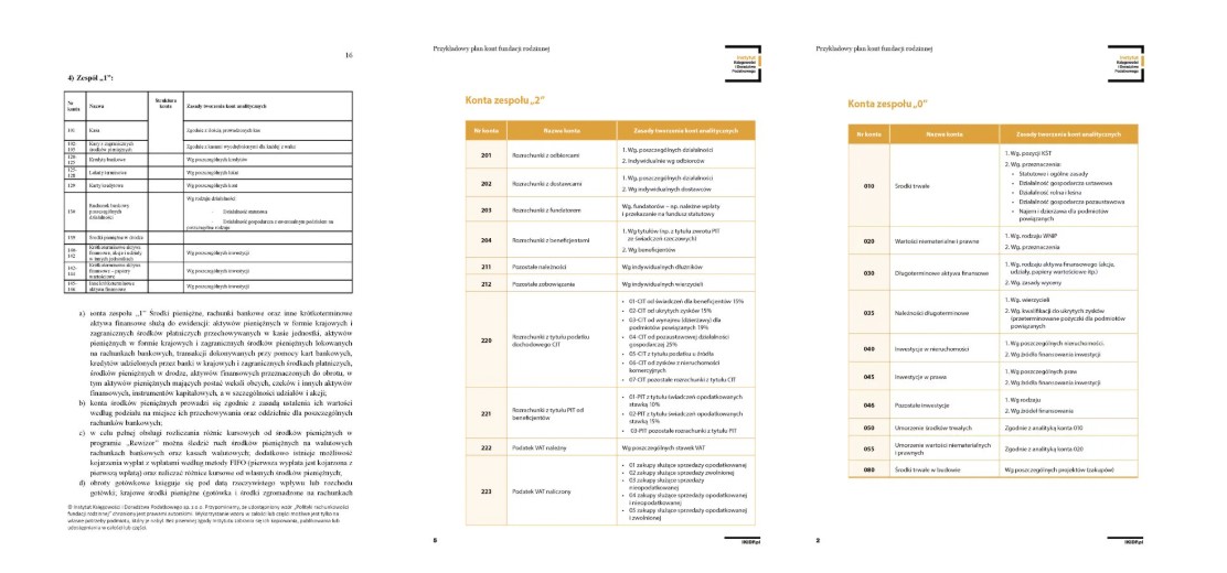 Pierwsze, co zobaczyła, to kompletna polityka rachunkowości fundacji rodzinnej – przygotowana specjalnie dla tego typu podmiotów, a nie przepisana ze spółki z o.o. Obok niej znalazła pełny plan kont, obejmujący wszystkie zespoły od 0 do 8, z opisem zasad działania kont, ich powiązań z ustawą i konsekwencjami podatkowymi dla fundacji oraz jej beneficjentów. Tego właśnie szukała, gdy próbowała samodzielnie zbudować plan kont od zera.